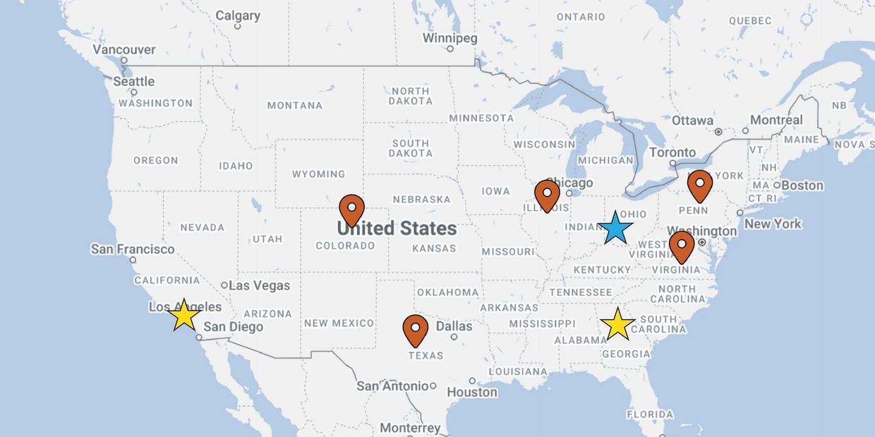 The map highlights the company’s key dispatch locations in Colorado, Texas, Illinois, Pennsylvania, and Virginia, supporting logistics and distribution across the U.S. It also marks office branches in California, Ohio (HQ), and Georgia, which handle administrative, operational, and corporate functions. These strategically placed locations ensure efficient operations and provide comprehensive support for the company’s nationwide network.